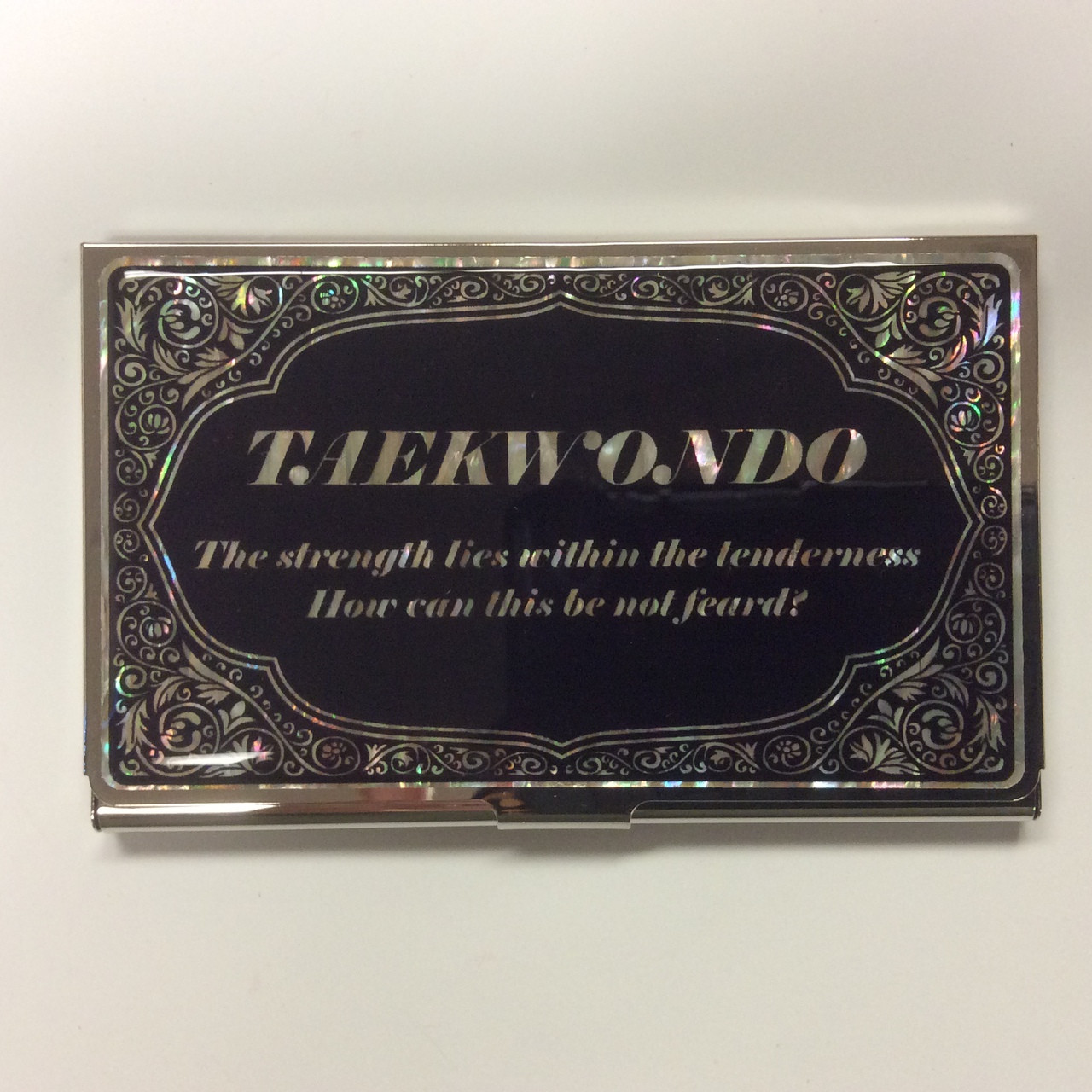 The top of this metal business card case is decorated with Mother of Pearl, a 1,500 year old traditional Korean craftsmanship. The decoration says "TAEKWONDO The strength lies within the tenderness. How can this be not feard?" Also can be used to carry credit cards.